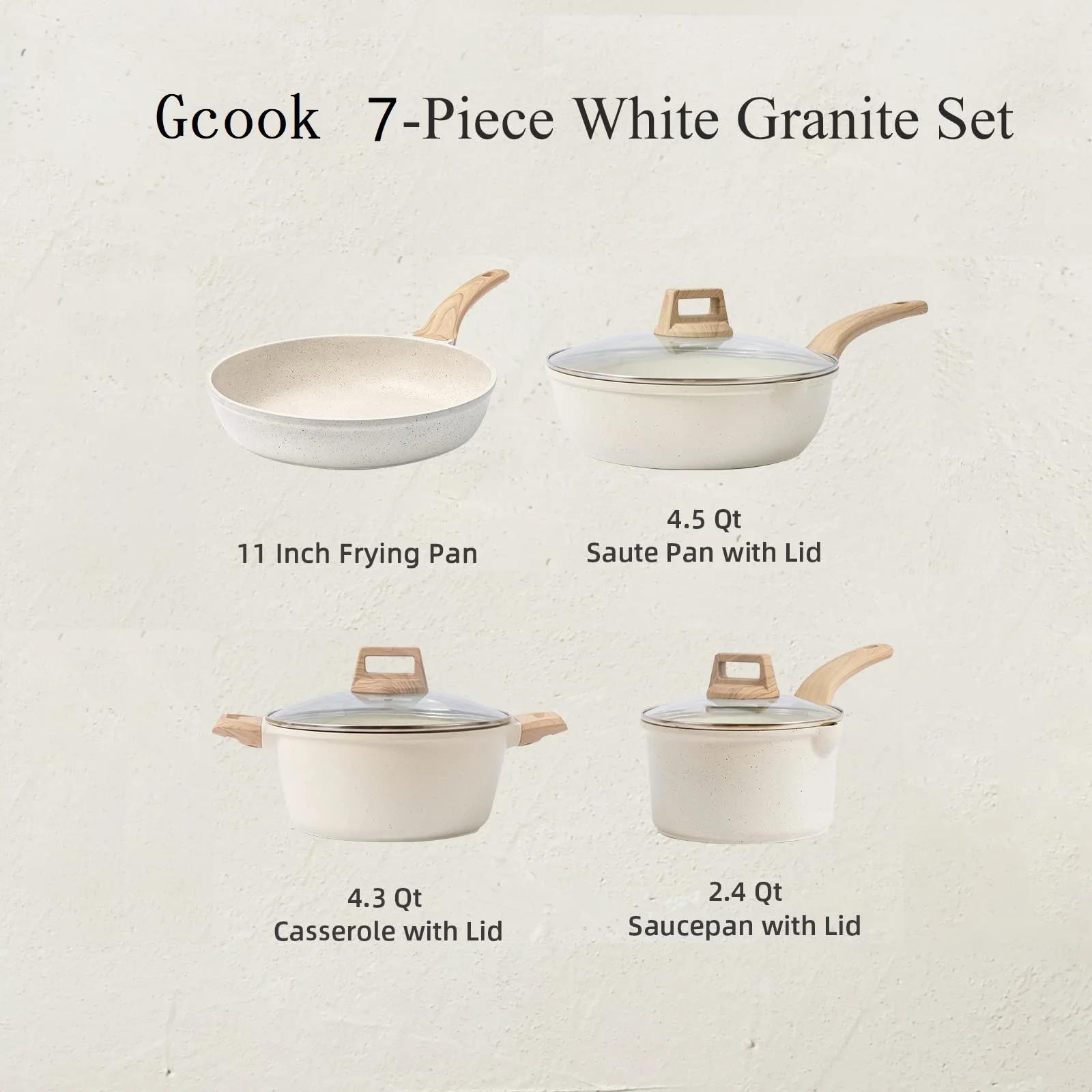 7-Piece Nonstick Granite Cookware Set – Induction Compatible Pots and Pans with Wooden Handles & Glass Lids, Cream White