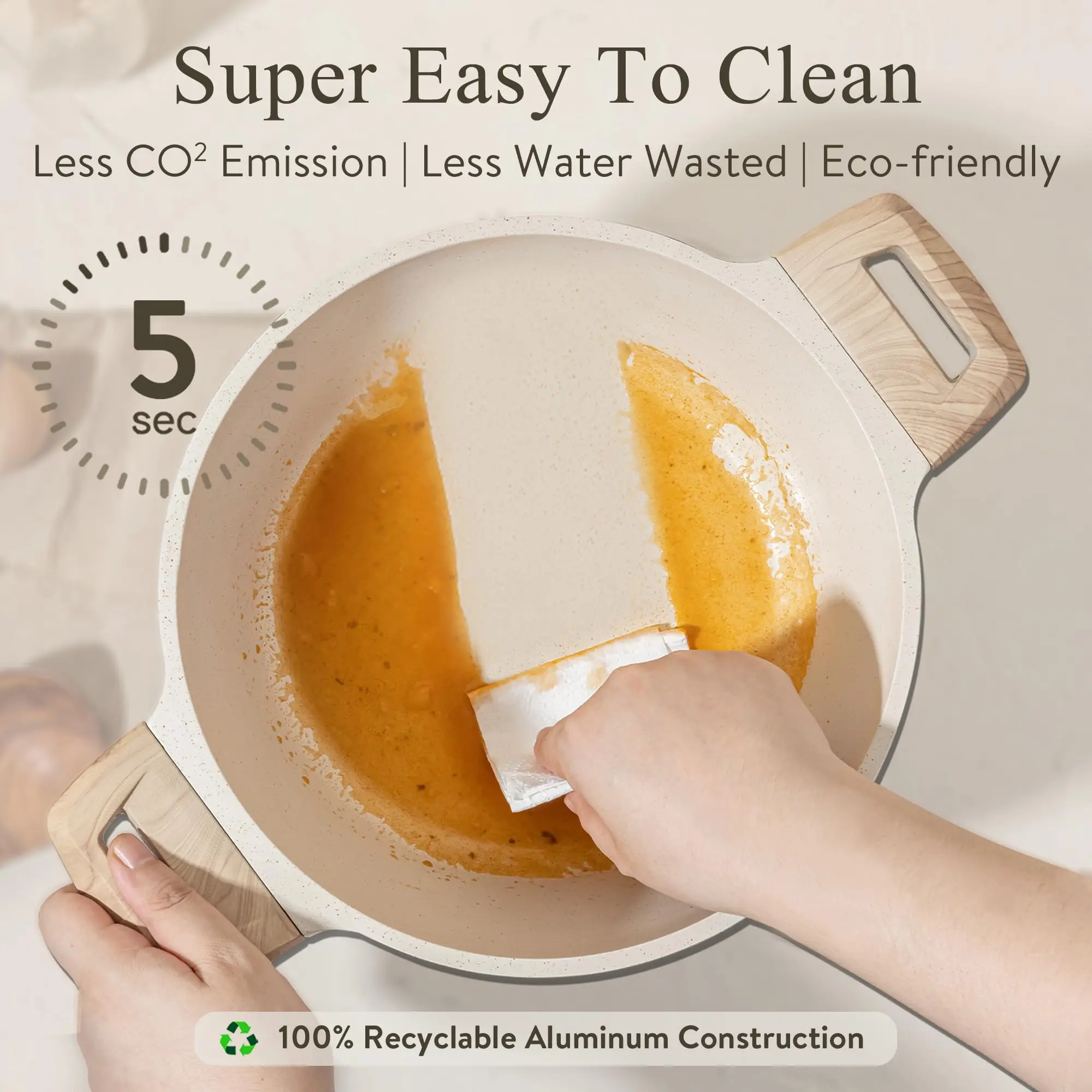 This set features smooth, natural-wood style handles that stay cool and provide a comfortable grip during cooking. The transparent tempered glass lids are strong, heat-resistant, and allow you to monitor your food without lifting the cover. The soft cream-white finish gives your cookware a refined, minimalist look that suits any kitchen décor, from classic to modern.
