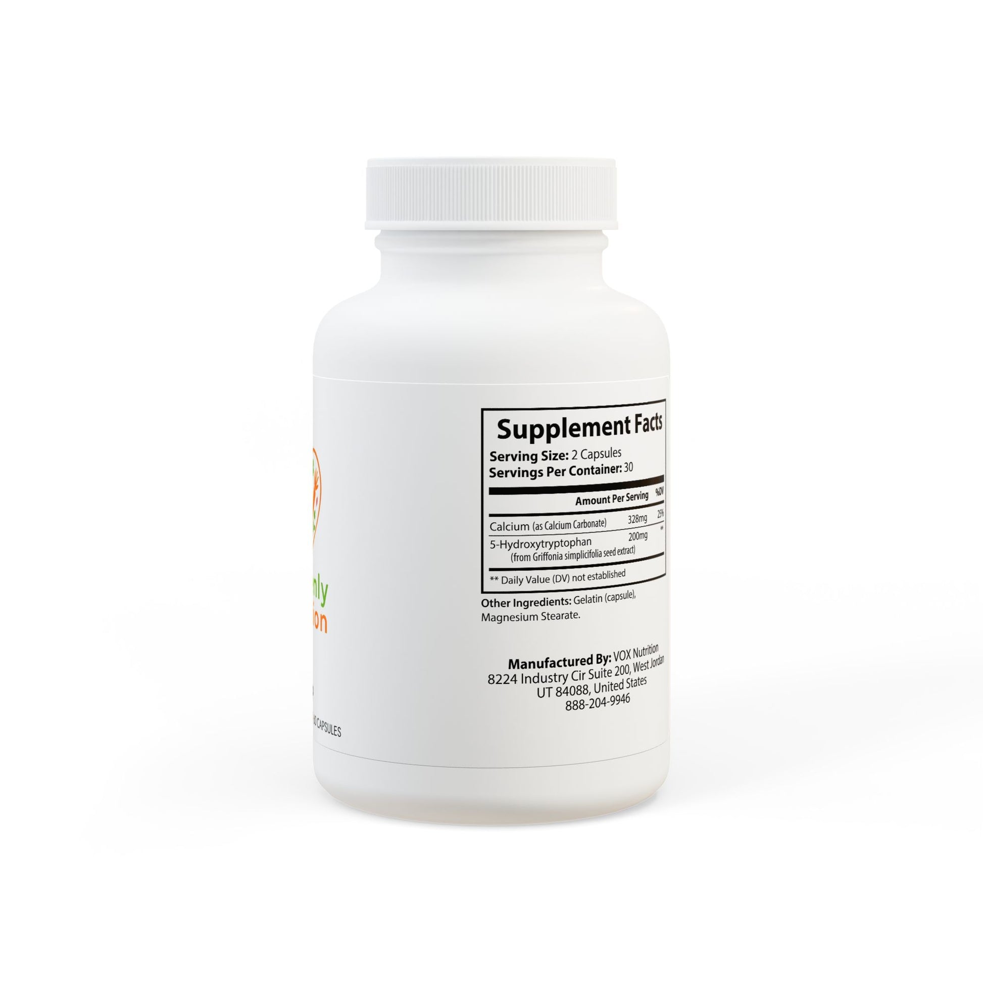 Ingredients: Calcium (as Calcium Carbonate), 5-Hydroxytryptophan (from Griffonia simplicifolia seed extract). Other Ingredients: Gelatin (capsule), Magnesium Stearate.
