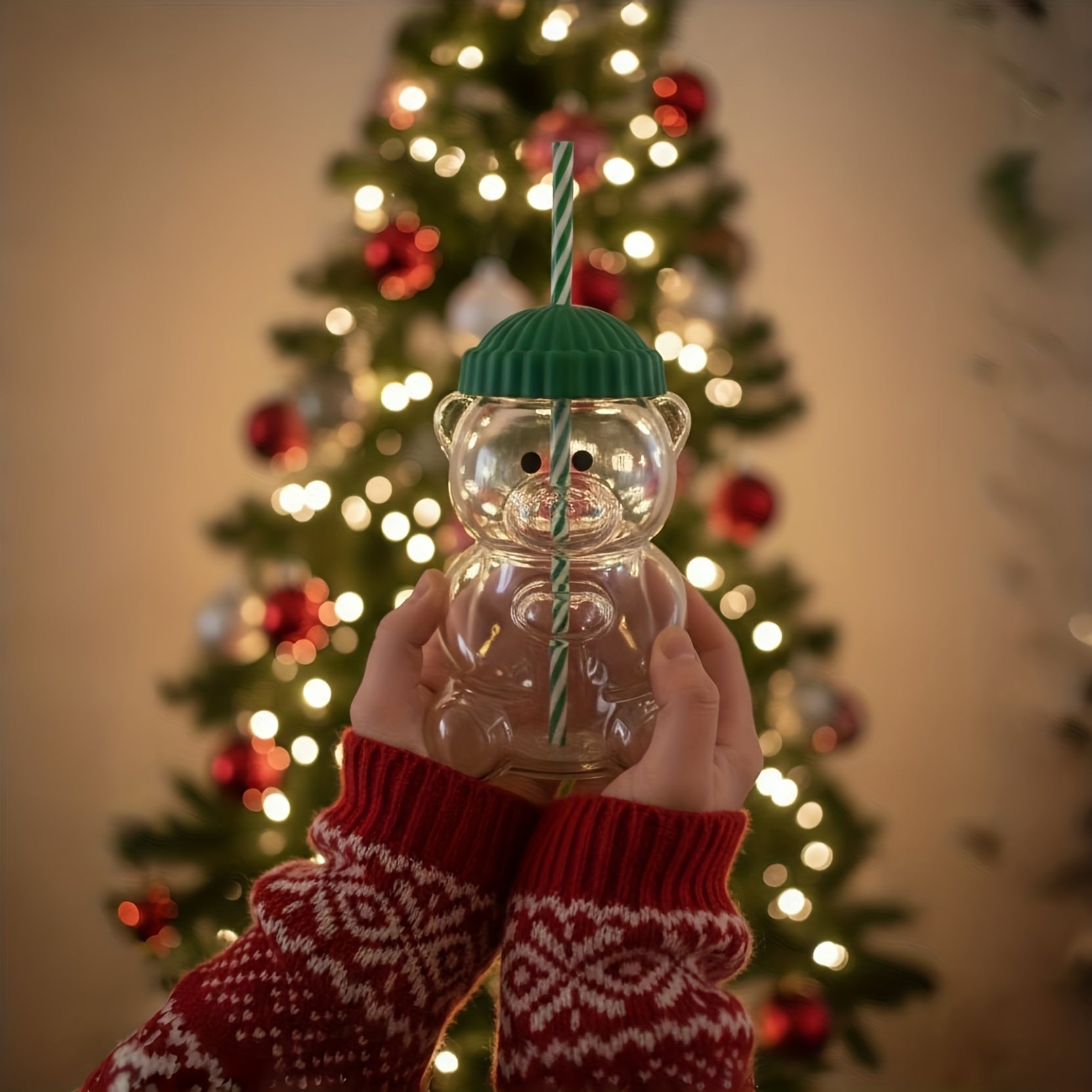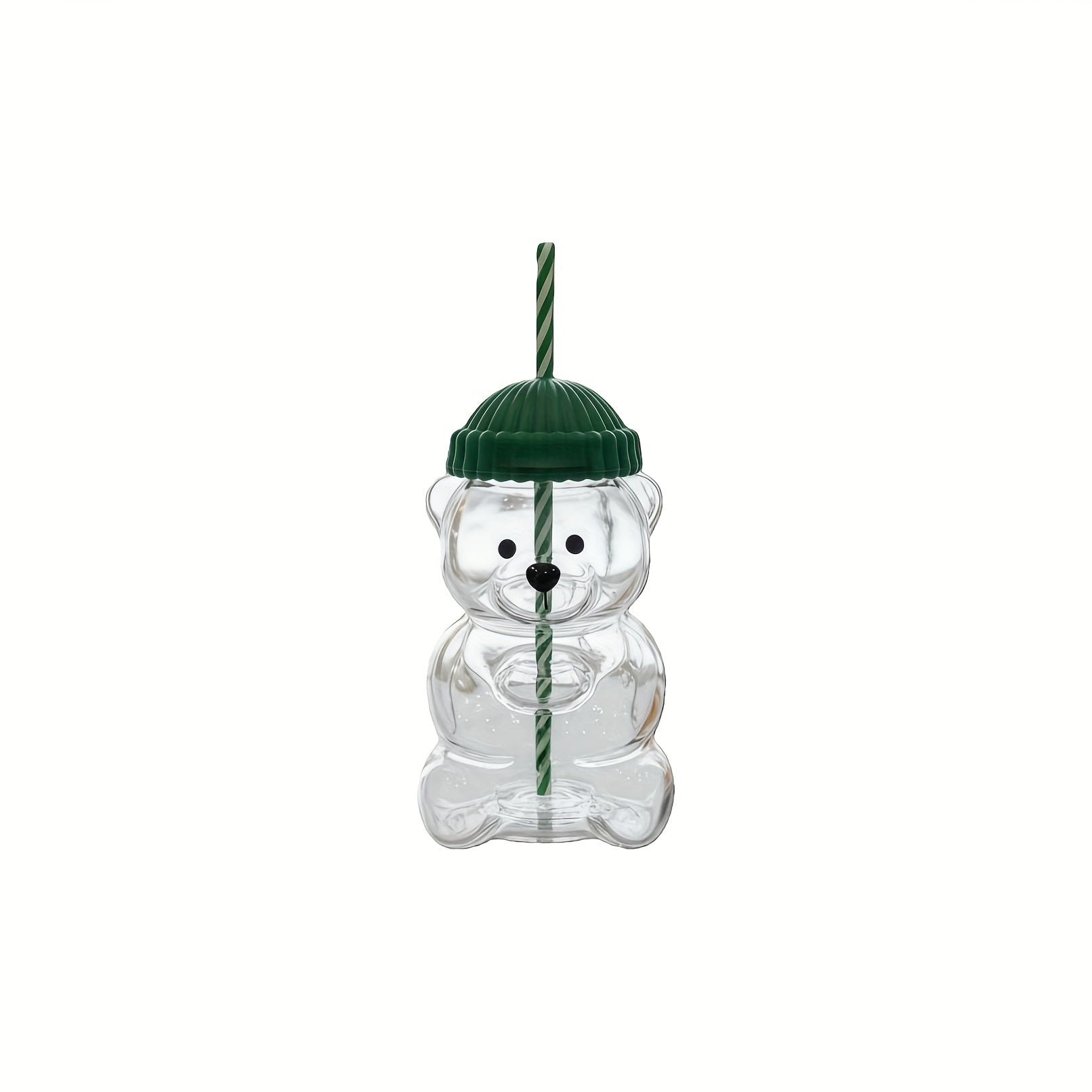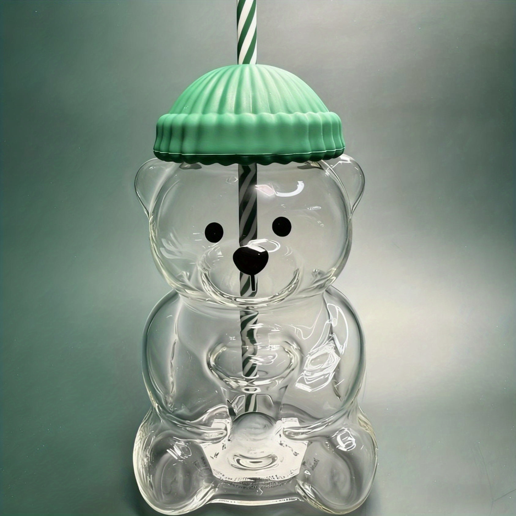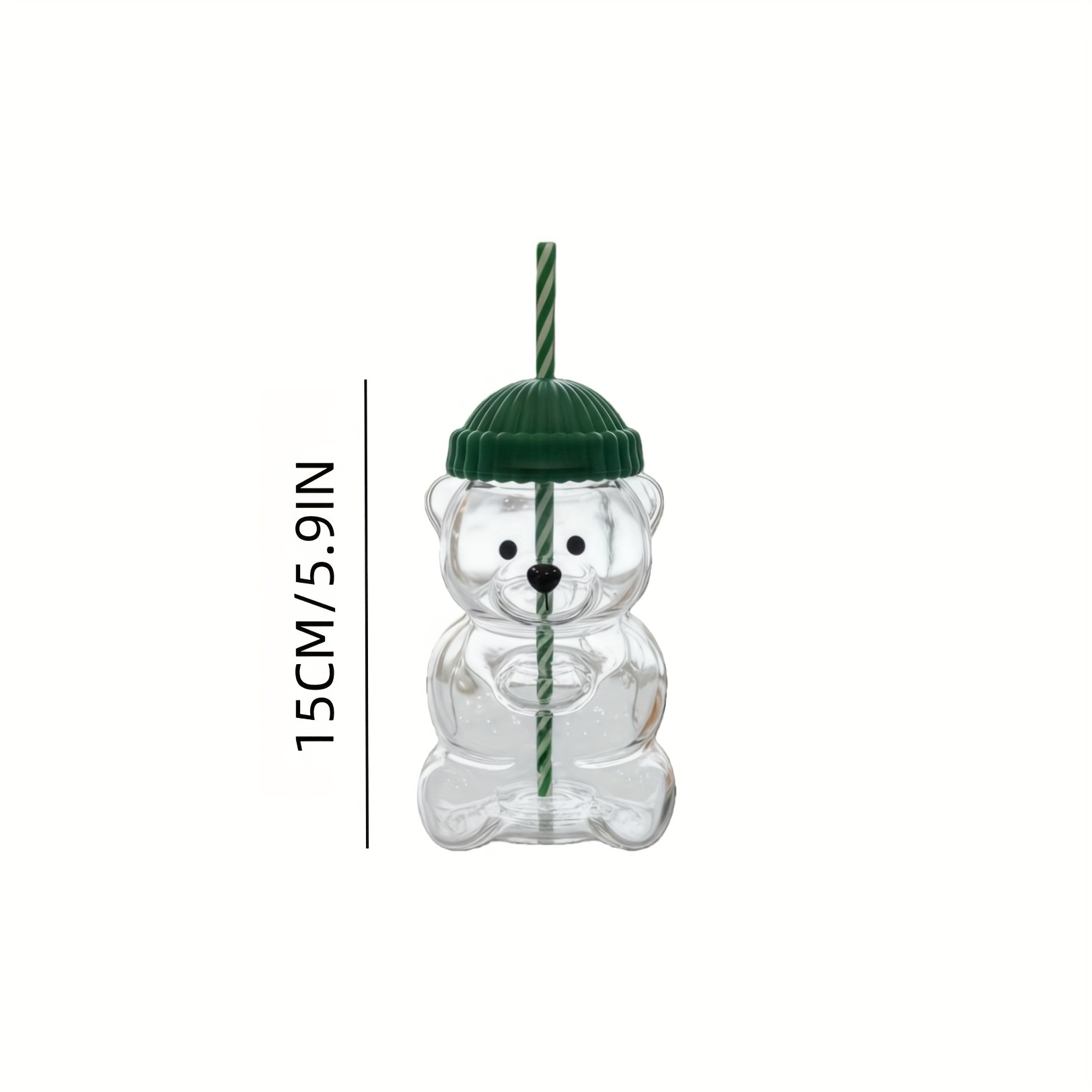🧸 Unique Design: Bear-shaped transparent glass with a green hat lid and straw