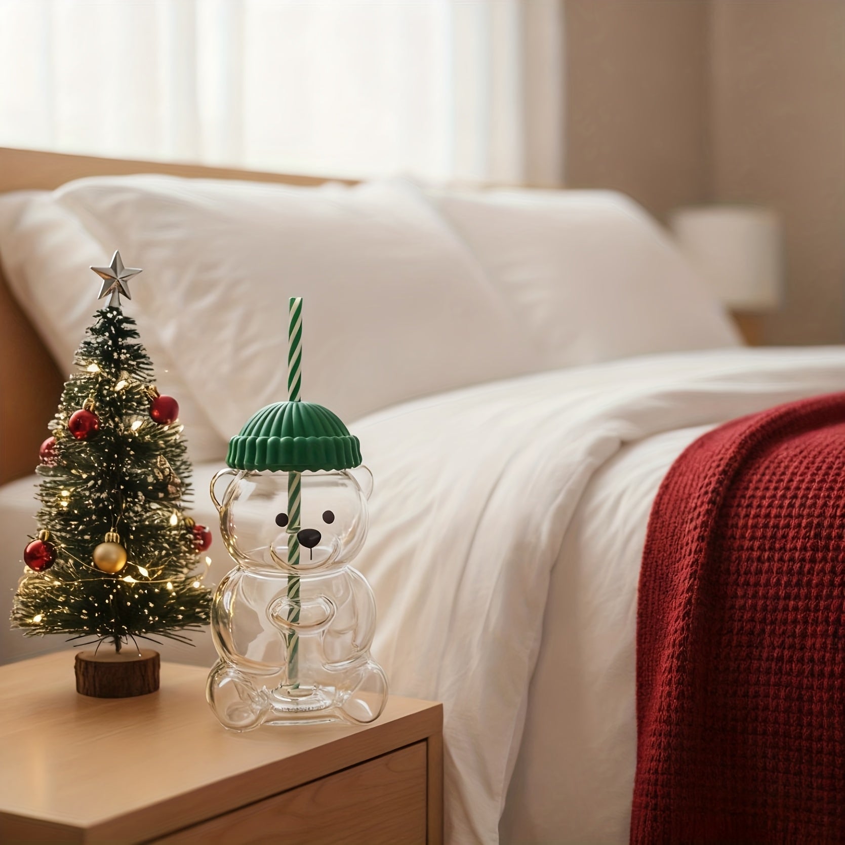 Enjoy your favorite drinks in style with this adorable Mini Bear-Shaped Glass Cup featuring a charming green hat lid and reusable straw. Made from durable, transparent glass, it’s perfect for daily use at home or in the office. This cute and practical cup also makes a thoughtful gift for Christmas, graduation, or other special occasions.